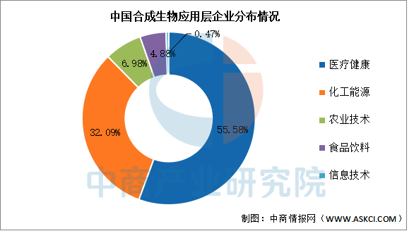从应用层企业的分布来看:医疗健康领域占比最高,达 55.53%,是当前合成生物商业化落地的核心赛道;其次是化工能源领域,占比 32.09%,两大领域合计主导超 87% 的应用层企业布局;农业技术、食品饮料、信息技术的占比较小,分别为 6.98%、4.83%、0.47%。