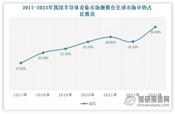 同时我国半导体设备市场规模在全球市场中的占比不断提升,2020年达到26.26%,首次成为全球最大的半导体设备市场;其后,其占比进一步提高,2023年达到34.43%,依旧保持领先地位。